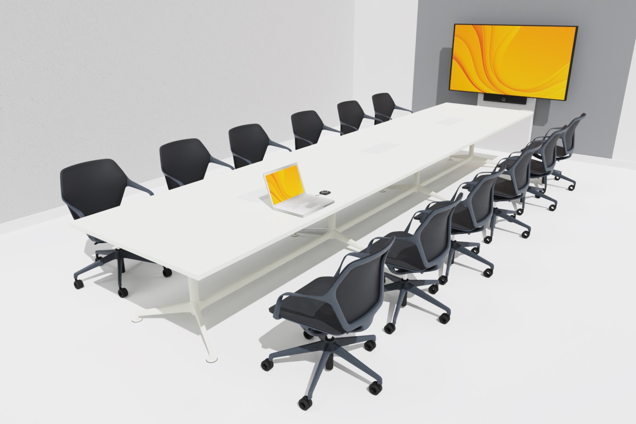 Das System basiert auf einem großformatigen 75″ 4K Professional Display, das auf einer fest montierten Medienstele installiert ist. In Kombination mit einer leistungsfähigen All-in-One Videobar entsteht ein klares, aufgeräumtes Raumbild mit optimaler Kamera- und Audioausrichtung für alle Teilnehmenden. Die integrierte drahtlose Signalübertragung ermöglicht es, Meetings direkt vom eigenen Laptop zu starten, unabhängig von der verwendeten Videokonferenzsoftware.